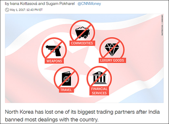 最新的禁令也得到了美国有线电视新闻网(CNN)的关注。CNN认为,印度切断和朝鲜的贸易,表明它成为加入联合国对朝制裁的又一个国家。