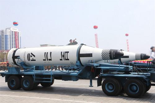 4月15日在朝鲜首都平壤举行的阅兵式上拍摄的“北极星—2”型潜射中程弹道导弹。 新华社记者朱龙川摄
