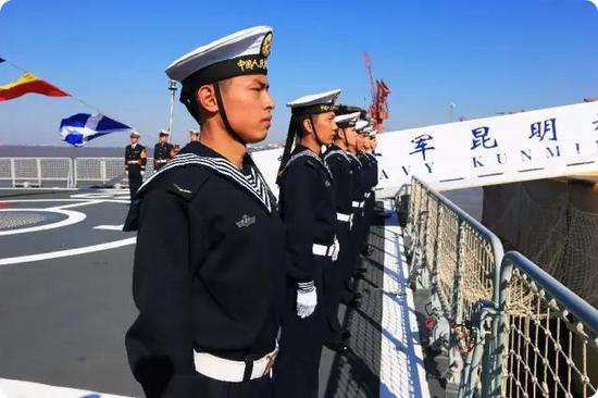 一次海上封控演练,昆明舰在蓝方编队全速突破封锁线的关键时刻,隐蔽机动到“敌”编队后方,反守为攻,与封控区内2艘红方舰艇实现夹击。