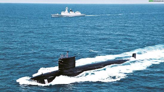 参与亚丁湾护航编队的中国海军093型核潜艇与054A编队航行在印度洋上