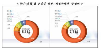 一个更典型的例子是,就在几天前,韩国政府公布的一组最新数据显示:今年第一季度韩国收到的所有来自海外的网购订单中,中国以80.6%的占比和高达6218亿韩元的绝对优势占据第一位,而排名第二的美国仅占5.9%,为458亿韩元。。。