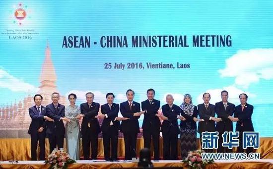 资料图片:2016年7月25日,在老挝首都万象,中国外交部长王毅(左六)和与会代表在会议开始前合影。当日,会议结束后,中国和东盟国家外长发布声明表示,中国与东盟承诺全面有效完整落实《南海各方行为宣言》,并在协商一致的基础上推动早日达成“南海行为准则”。