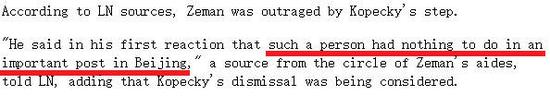 泽曼甚至考虑将科佩茨基从驻华大使的位置上解职,但是,由于一个多月前,捷克驻瑞士的大使刚因为丑闻遭到解职,科佩茨基由此得以“幸免”。