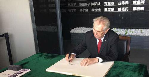 捷克总统泽曼在南京大屠杀遇难同胞纪念馆签字留言。