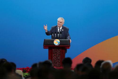 5月14日,捷克总统泽曼在“一带一路”国际合作高峰论坛上发表演讲。(路透社)