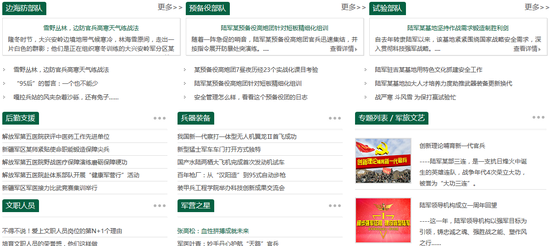 中国陆军官方网站——中国陆军网5月16日改版,在首页的专栏区新增了边海防部队、预备役部队、试验部队三个板块。中国陆军推出边海防部队、预备役部队、试验部队三个板块,反映三支部队大事纪、部队动态、官兵生活等方方面面,凝聚官兵智慧,汇集强军力量。