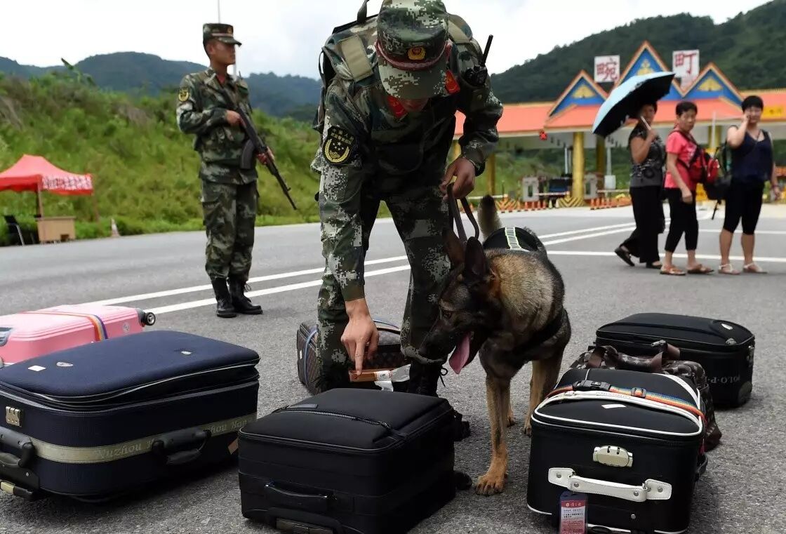 ▲资料图片:中国警犬缉毒队在中缅边境的公路边,检查中巴车的乘客行李箱。