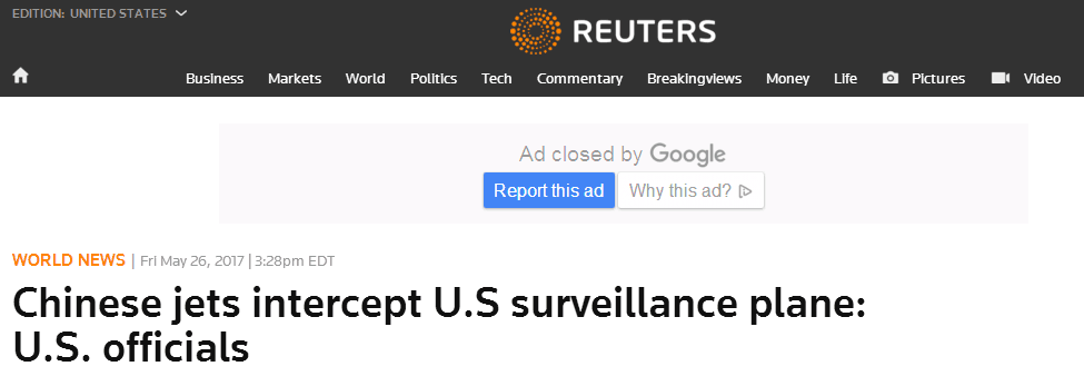 英国路透社26日称,在本周三(原文如此),两架中国战机还在香港东南部的南海空域拦截美国海军侦察机,其中一架中国战机最近距离美机约200码(180米)。
