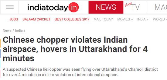 原标题:印媒称疑似中国直升机侵犯印领空 停留约4分钟