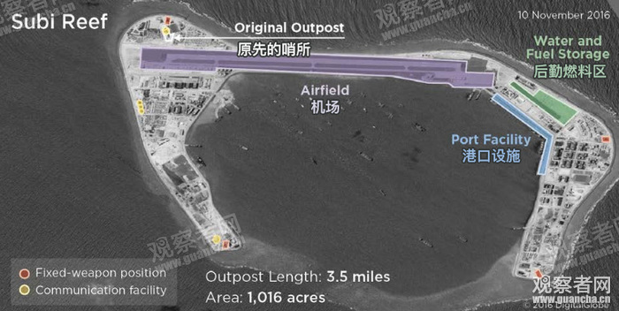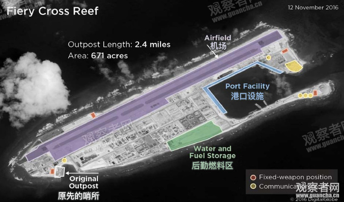 报告称:“在北京于2015年年底停止在南沙群岛建造人工岛后,由中国控制的7个岛礁均未继续填海造岛。2016年,中国的主要精力都花在了南沙群岛前沿基地的基础设施建设上。中国已经在南海建设3座岛礁机场,这些机场的跑道长度超过2600米。一旦这些设施全部完工,中国将有能力在南沙群岛上部署3个歼击机团,超过70架战斗机。”
