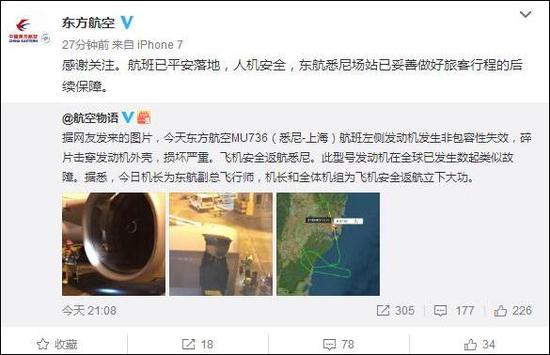 另据@东方航空 消息,6月11日,东航悉尼至上海航班起飞后,机组发现左发进气道机匣损伤,果断处置,及时返航,安全落地,人机安全。东航已妥善做好旅客的后续服务保障。
