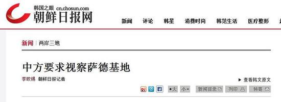 [环球网报道 记者 丁洁芸]韩国“朝鲜日报网” 6月14日以“中方要求视察萨德基地”为题发表了一篇报道称,“中国政府近日向韩国政府提出,要求视察位于庆尚北道星洲的驻韩美军萨德基地现场”,并称,“在朴槿惠政府时期中方也曾提出过同样的要求”。不过,韩国政府方面14日回应称,从未从中方那里收到类似要求。