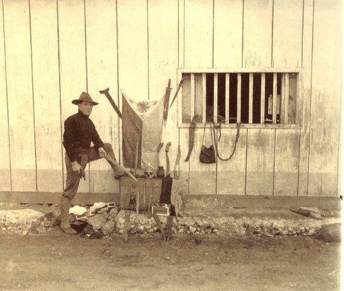 1901年一名在菲律宾的美军士兵展示缴获到菲律宾当地武装力量的旗帜。