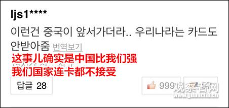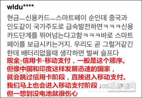 有韩国网友总结说,中国发展迅速,直接跳过了信用卡阶段,进入移动支付阶段,而韩国还没发展到那一步。