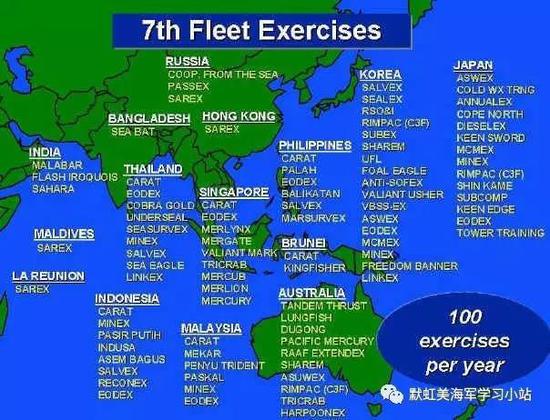 根据Globalsecurity.org的统计,美国海军太平洋舰队在亚洲地区每年要举行超过100场演习,注意是演习(Exercises),区别于日常训练(trainning)和考核,即我们所谓“贴近实战”。有不贴近实战的演习么?呵呵。