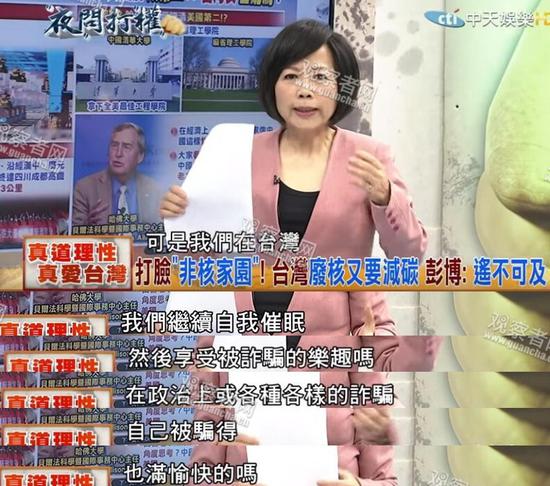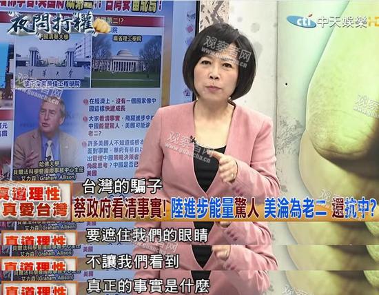 观察者网消息:[文/观察者网 林西]前几天,在一档台湾节目中,女主持人妄言“大陆长期在盗用、窃取我们科技产业的机密,台湾到底应该怎么防止?”让现场嘉宾都看不下去。没过几天,在另外一档台湾政论节目《夜问打权》中,主持人和嘉宾也猛夸大陆。