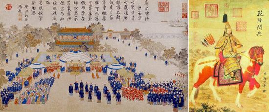 左图为《平定廓尔喀战图》册之《廓尔喀使臣至京》,图中乾隆皇帝在中南海紫光阁接见廓尔喀使臣。乾隆皇帝自称“十全老人”,其中就有征战廓尔喀