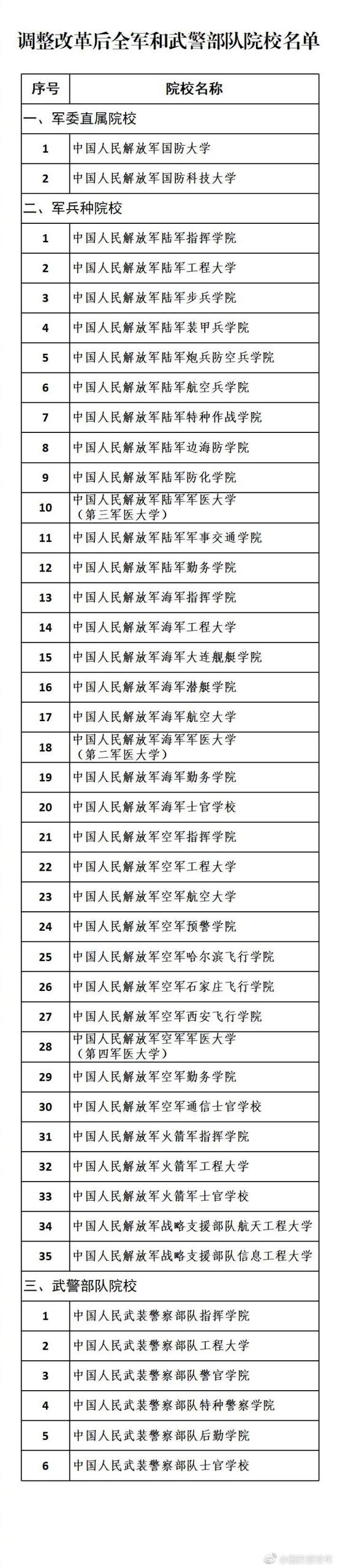 最新权威发布——调整改革后,全军和武警部队院校名单