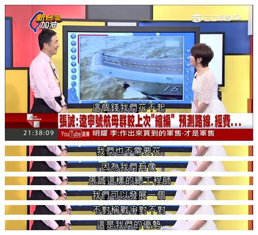 6月26日,台湾亲绿政论节目《新台湾加油》中,号称台湾“航母杀手”的“雄三”导弹前总工程师张诚做了这样一番分析,称“辽宁号从北部这样走下来,其实是很耗钱的一件事情。一个国家要养航空母舰是非常昂贵的”。