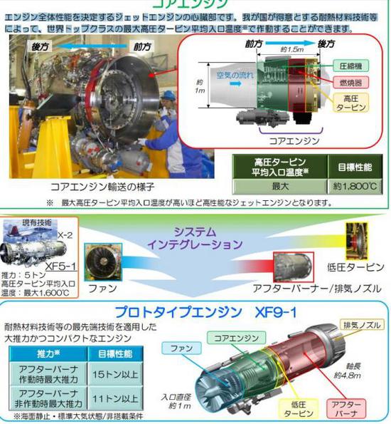 日本此前在“心神”试验机上采用的XF5-1发动机推力仅有5吨,最大涡轮前温度1600摄氏度。而XF9-1的涡前温度比它又提高了200摄氏度,日本方面因此自豪地宣称在XF9-1原型机上使用了世界级的先进技术。