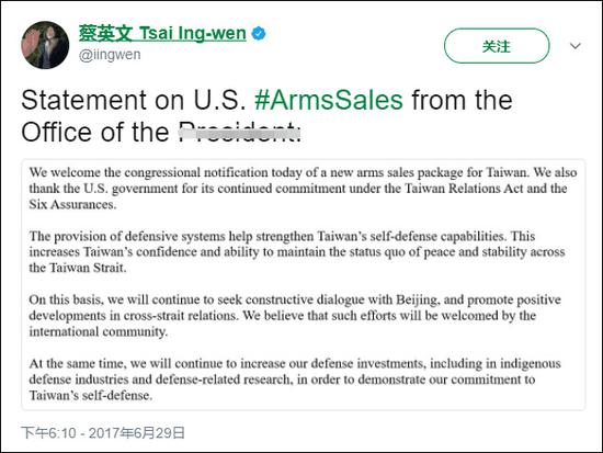 此外,美国务院29日批准向台军售后,台当局30日上午急发声明稿致谢,蔡英文随后也通过个人推特转发声明稿英文版感谢。声明称,美国政府稍早为对台军售项目正式向国会发出通知书,“我们表示欢迎”;美国政府履行“对台湾关系法”与“六项保证”,“我们也表示感谢”。
