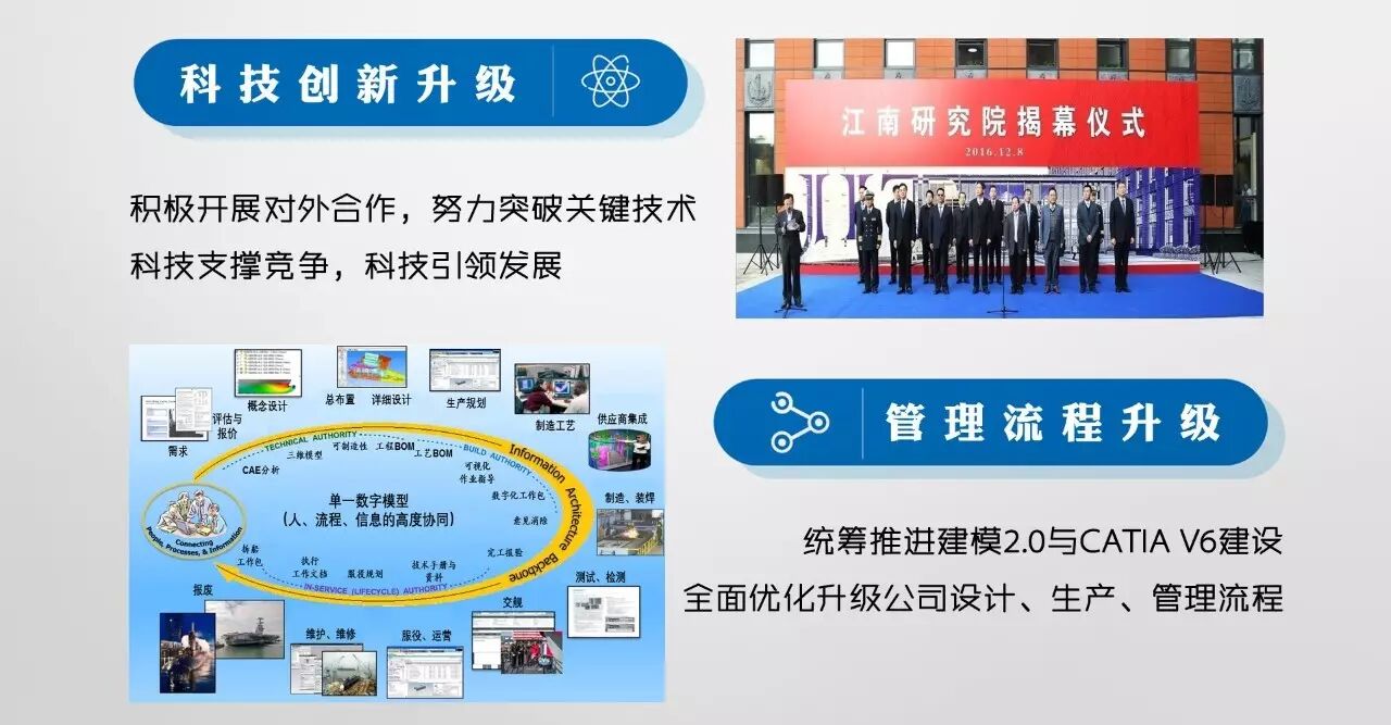 江南造船以组建江南研究院为契机,积极开展对外合作,努力突破关键技术,充分发挥科技对竞争的支撑和对发展的引领作用,推进科技创新升级。针对管理流程升级,江南造船统筹推进建模2.0与CATIA V6建设,全面优化升级公司设计、生产和管理流程,打造江南独特竞争优势。