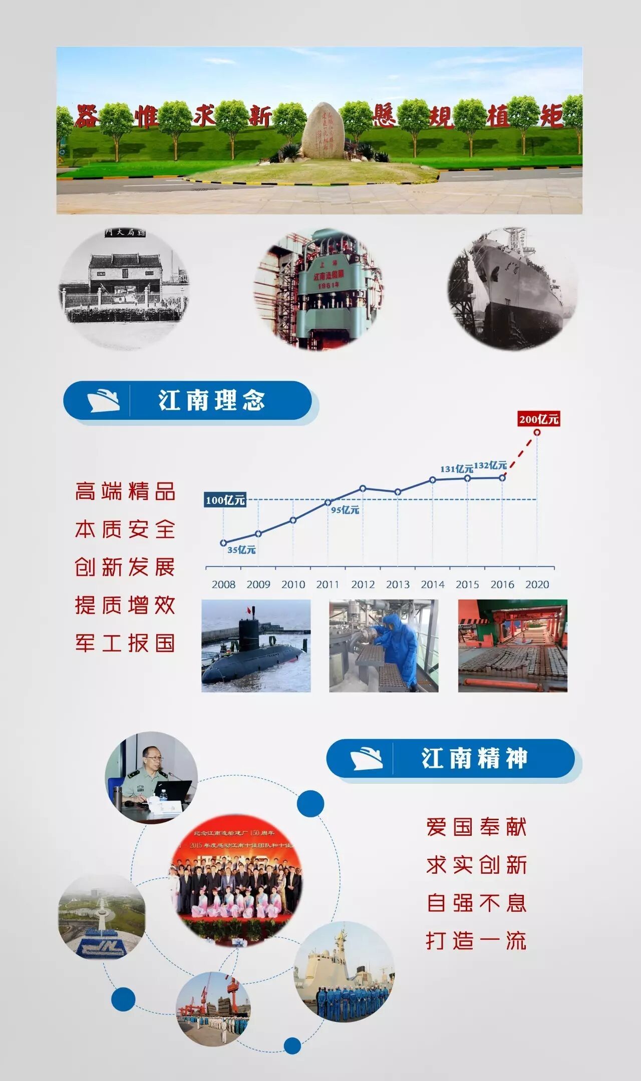 江南造船拥有152年的光辉历史和深厚的文化积淀;在新的历史征程中,江南造船继续加强企业文化建设,弘扬江南精神,落实江南理念,为改革发展注入强大的内生动力。