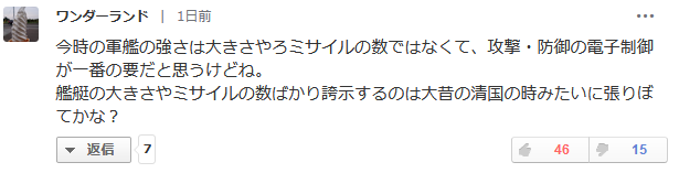 当今评价军舰强于不强并不是看舰体大小和导弹数量,而是最重要的攻击与防御的电子控制系统。如果只是单一炫耀舰体大小和导弹数量的话,难道不像很久之前的清朝(暗示洋务运动的北洋水师)一样?(以史为鉴,这样的日本人不多了)