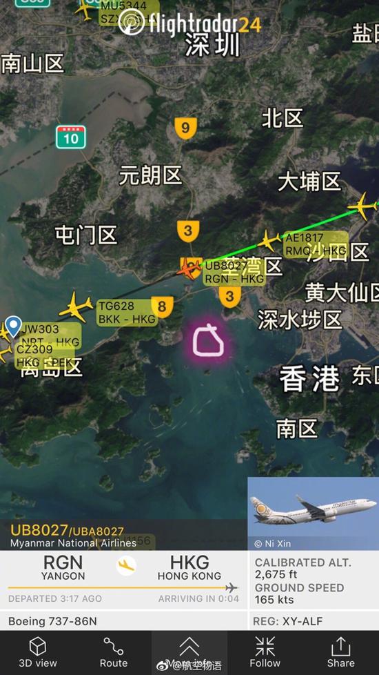 据航空自媒体“航空物语”报道:今天飞往香港的时候,坐在左侧可以清楚看到辽宁号航空母舰。(红圈位置)当然风向变了从另一端跑道降落就看不到了。