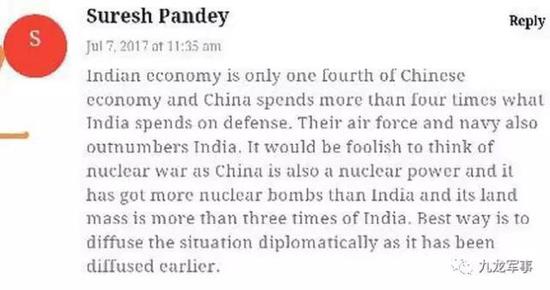 suresh pandey说:印度经济是中国的四分之一,中国在国防上的支出是印度的四倍!他们的空军海军远超印度!认为可以核战是很愚蠢的,因为中国拥有比印度更强的核武器,并且中国国土面积是印度三倍!最好的办法还是早点进行外交斡旋吧!(这个印度人还是很客观的)