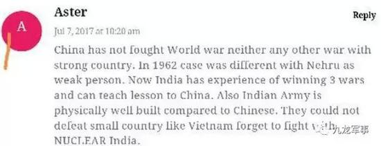 Aster说:中国既没有打过世界大战,也从来没有跟强国打过战!1962年事件,是因为尼赫鲁是个软弱之人!现在印度已经经历了3次战争的胜利,是时候教训中国了!相比于中国,印度军队得到很好的建设,他们连小国越南都打不过,别幻想着跟拥有核武器的印度打战啦!(这个印度人是不是历史都是零分?你们教科书是乱写的吧?)