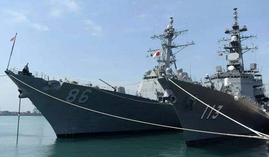 日本海上自卫队则派了“出云”号直升机驱逐舰和”涟“号驱逐舰参演。“出云”号是日本海上自卫队最大级舰船,具有航母式的“全通甲板”,因此也被军事评论人士归类为“准航母”,该舰稍加改装便可变成一艘“真航母”。