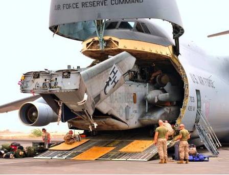 美军运输机在吉布提军事基地卸载美军目前最大最重的CH-53E重型直升机(图片来源:中国日报网)