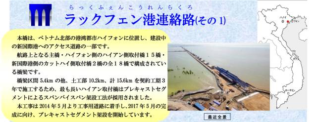 据了解,新武—沥县跨海大桥的构造为,航路上的主桥,位于海防市海安一侧的安装桥15架,处于新国际港吉海一侧的安装桥2架,由总共18架构成。其中海上段长度5.4千米,土木段为10.2千米,总计15.6千米(我国的杭州湾大桥全长36公里),设有双向4车道,时速达80公里。
