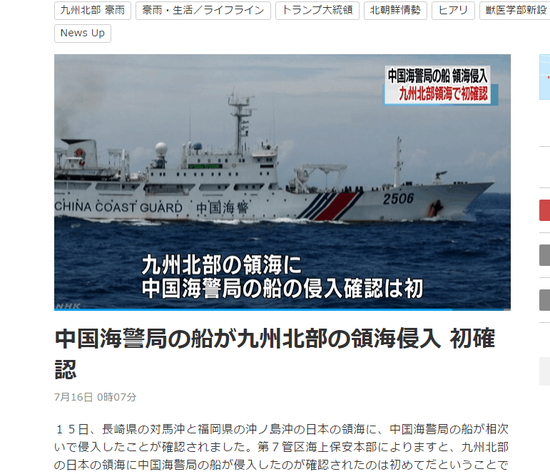 [环球网报道 记者 余鹏飞]据日本NHK电视台7月16日报道,两艘中国海警局船只相继“闯入”长崎县和福冈县的日本“领海”。日本第7管区海上保安本部称,这是首次确认有中国海警船“闯入”九州北部“领海”。