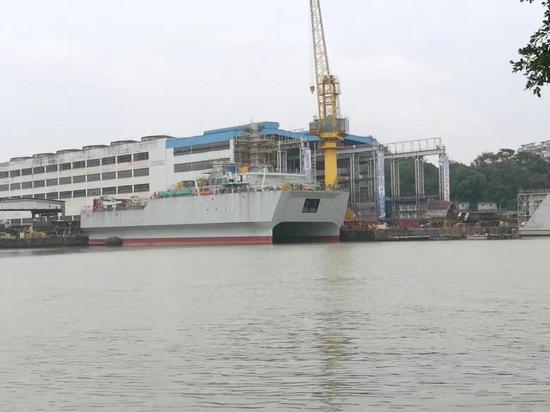 目前,一艘海军新型双体船就在港池内静静舾装, 不过本次下水的双体船与此前的还是存在着较大的区别。首先就是体形上的区别,新型双体船在体型上比先前的大了一圈,预计排水量在3000吨左右,带来的好处就是能够携带更多的探测设备,可以更好的侦测及追踪潜艇等海底威胁,进行情报搜集工作。新型双体船后部带有直升机平台,这样的配置在军用双体船中较为罕见,对于整舰战斗力的提升是显而易见的。(作者署名:浩汉防务)