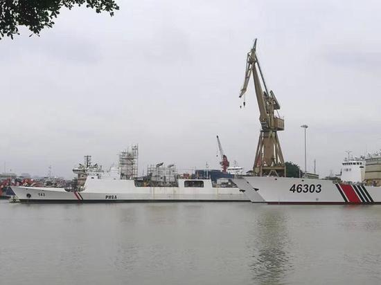 除了自用公务船外,为巴基斯坦海事安全局建造的1500吨级海事巡逻船首制船也更换了一个泊位,展开进一步的舾装测试工作。该船在比较接近此前黄埔造船厂为原海关建造的1500吨缉私舰,可以说是缉私舰的一个简化版,武器装备上基本保持一致,配备有舰艏30mm舰炮以及机枪等。 在现阶段公务船云集的黄埔厂,身着灰色军装的海军舰艇就显得尤为稀有,更为稀有的就是首次公开的型号了。