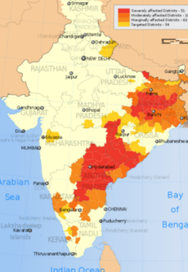这支神奇的力量,也就是上文提到的1比75的印共(毛)。早在上世纪60年代,这股势力就领导了一场叫做“纳萨尔巴里起义”的运动,反抗地主对农民的盘剥,得到广大农民(还有很多女农民)的支持。后来,纳赛尔派影响到的势力范围越来越广,遍及印度多个邦。它所影响到的地区被称为“红色走廊”,下图红色部分即为曾统计过的印共(毛)势力范围。这个组织被印度前总理辛格称为“印度国内最大的安全威胁”。据说,许多此派分子的办公室、还有家里,都贴着毛主席的画像。