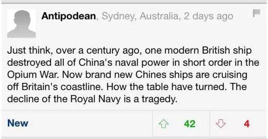 ▲一个世纪前,在鸦片战争中,现代化的英国军舰歼灭了中国海军,现在,中国的军舰在英国的海岸线巡航。世道变了,皇家海军的衰落就是个悲剧。
