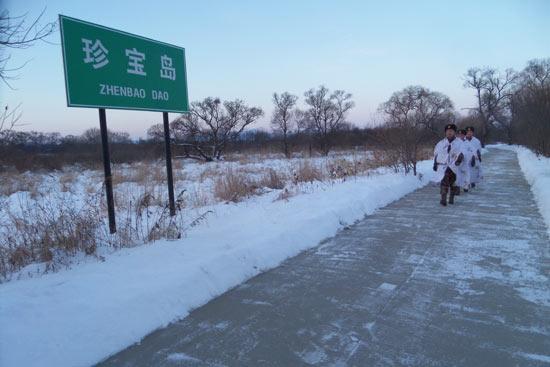 在珍宝岛上,除了营房周边的小块生活区、训练区,以及沿岛铺设一圈的水泥路,其他地方大都插着“雷区危险”的警示牌。每天下午,北部战区边防某旅珍宝岛哨所的哨长胡春震,都会带领战士们在环岛水泥路上进行体能训练,沿着环岛路跑2圈,刚好5公里。