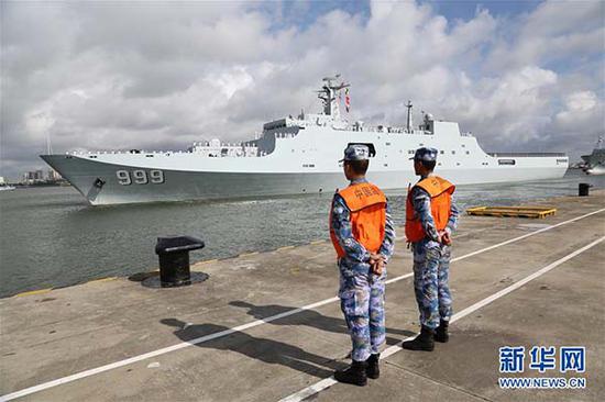 7月11日,搭载驻吉布提保障基地官兵的舰船解缆起航。当日,中国人民解放军驻吉布提保障基地成立暨部队出征仪式在广东湛江某军港码头举行(新华社记者 吴登峰 摄)