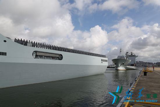 吉布提保障基地官兵在井冈山舰、东海岛船分区列队( 新华社记者 吴登峰 摄)