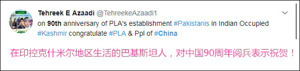 本来以为这场大戏就要结束了,结果邻居巴基斯坦人民赶来支援,一位“巴铁”的发言引人深思,“在印控克什米尔地区生活的巴基斯坦人,对中国90周年阅兵表示祝贺”。