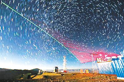 图为“墨子号”量子科学实验卫星与阿里量子隐形传态实验平台建立天地链路(2016年12月9日摄,合成照片)。 新华社记者金立旺摄