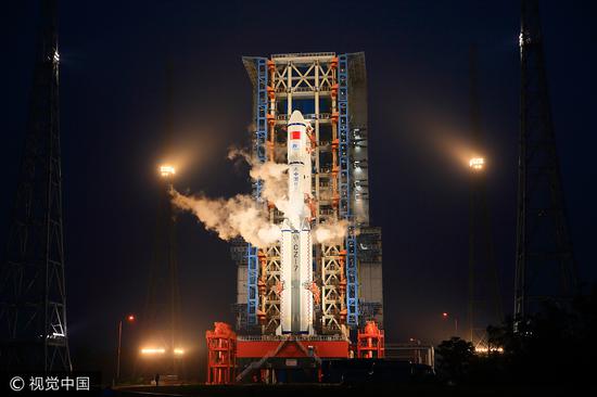 2017年4月20日19时41分,海南文昌,我国自主研制的首艘货运飞船天舟一号发射升空。图片来源视觉中国
