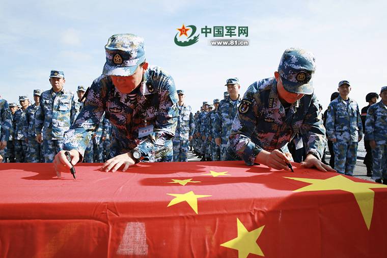 编队指挥员赵纪成、政委杨志亮带领官兵,在国旗上签名。