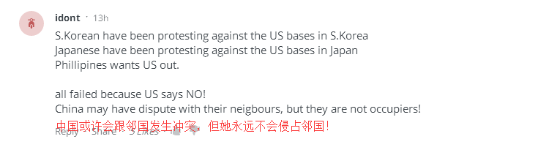 还有网友说,韩国曾对美国驻韩军事基地提出过抗议,日本也曾抗议过美驻日军事基地,菲律宾还希望美军滚出菲领土呢,但他们最终都失败了,因为美国不同意呢~你们看,中国就不会这样,因为中国或许会与邻国发生冲突,但她不会去侵占别国的领土!