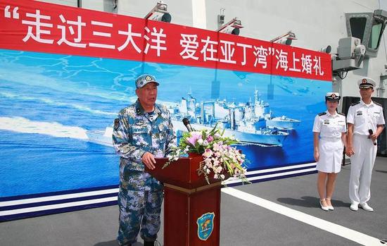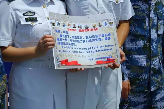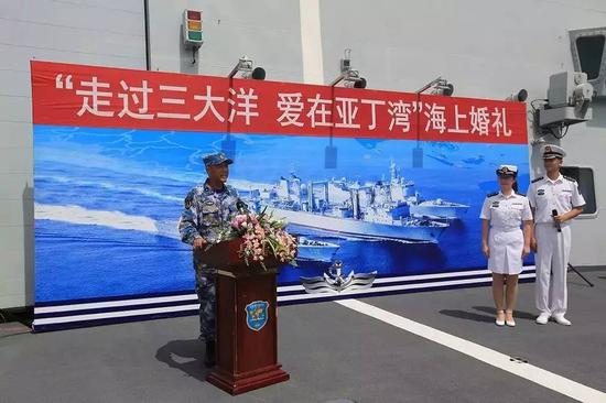 是大国海军的深蓝航道给了你们这场深蓝婚礼。”
