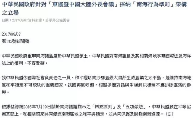 对此,台当局“外交部”7日发布新闻稿称:“南海诸岛属于中华民国领土,中华民国对南海诸岛及其相关海域想有国际法及海洋法上的权利,不容置疑”。