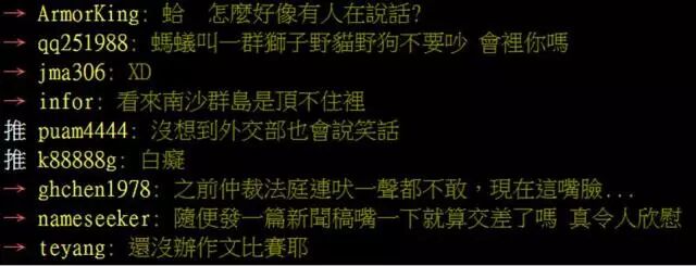 不过,此表态却招来了台湾网民的冷嘲热讽,称此声明是“蚂蚁叫一群狮子野猫野狗不要吵。”